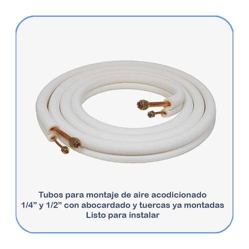 Kit de tubos para montaje de aire acondicionado, compuesto por 2 tubos uno de 1/4" y otro de 1/2" recubiertos de aislante blanco, en las puntas lleva hecho el abocardado y las tuercas montadas.